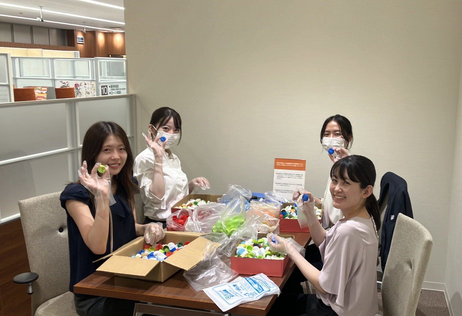 ・白木原支店では銀行の窓口やお取引先企業さまにも職員手作りのペットボトルキャップ回収BOXを設置させていただき、この取組みの輪を広げていくことで地域一体となって、社会貢献をしたいと考えています。